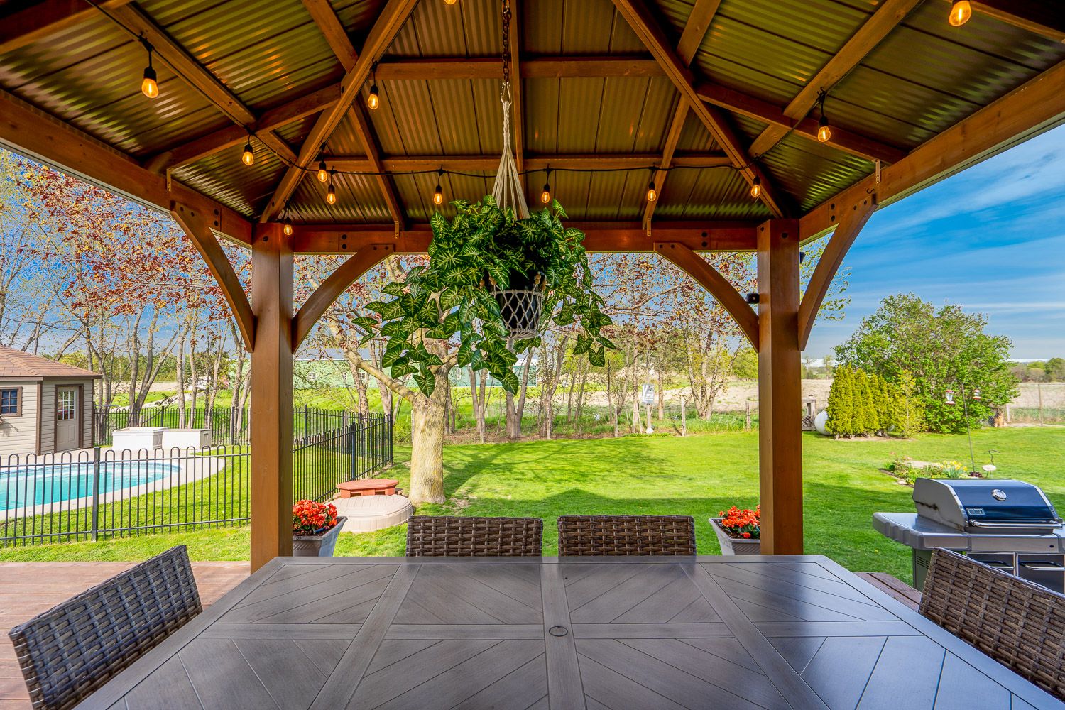 Dream backyard with 18 x 36 pool, custom pool shed, large patio area, 35 x 14 deck with 12 x 12 cedar gazebo, and 4 person salt water hot tub