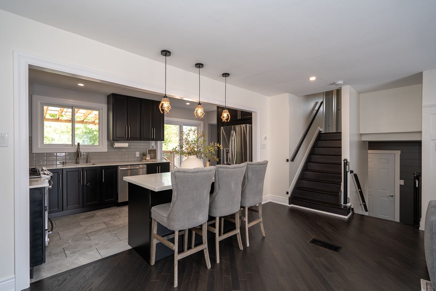 Upgraded kitchen with quartz counter, SS appliances, and island walks out to back deck