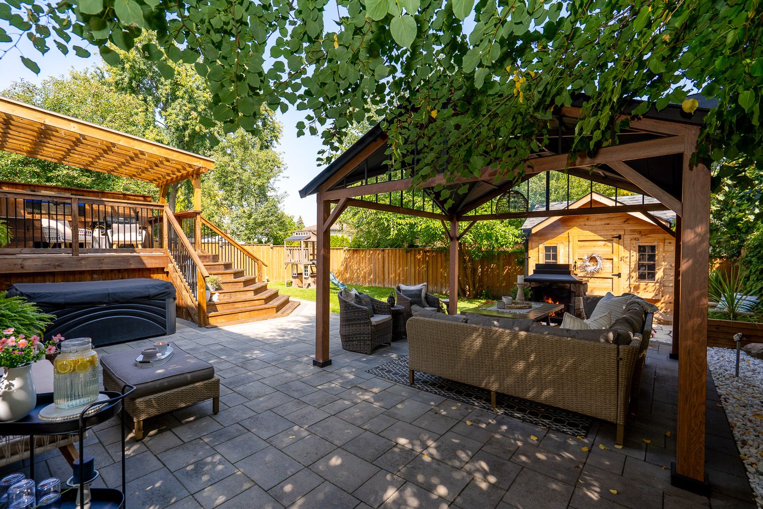 You won't find many backyard nicer than this one: Fully fenced (new), full privacy with several mature trees, new patio, new covered deck, outdoor kitchen, heavy duty gazebo, outdoor fireplace, plug n' play hot tub, and nice wood shed, it really is a 10/10