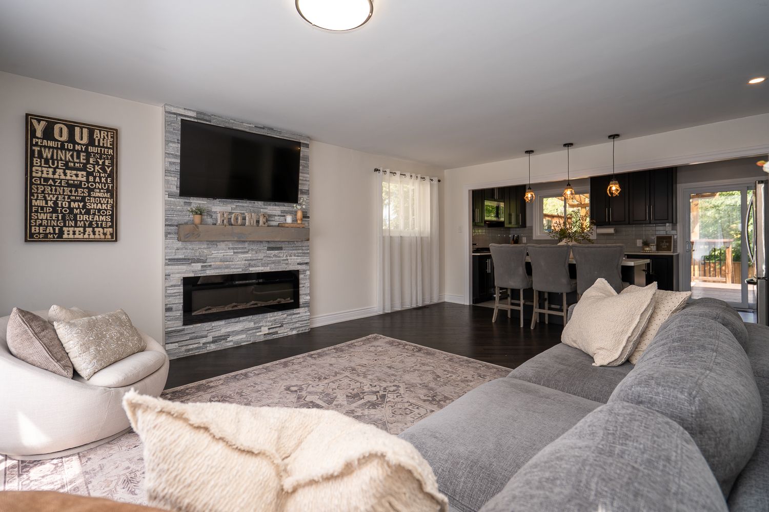 Open concept living/kitchen area with electric fireplace featuring stone surround, offers a bright, spacious area for day-to-day living